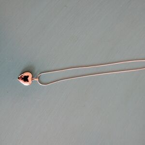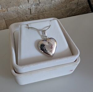 New in box never worn silver heart locket pendant necklace. Box has some damage and stains from storage, please review carefully for condition. Comfortable and lightweight snake chain for classic everyday wear.