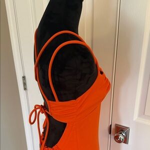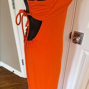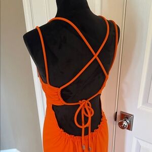 Bold orange maxi dress with spaghetti straps. Perfect for a stylish look. Adjustable back straps make it perfect for all bust lines and offers suppprt. 58” shoulder to hem. Fully lined. Like new