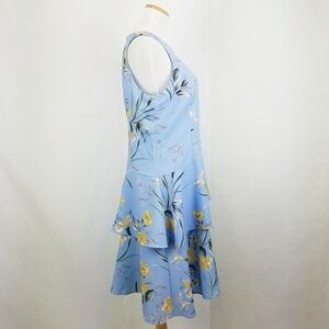 This beautiful Bar III dress features a blue and yellow floral print with an asymmetrical design and a layered skirt. It's knee-length and sleeveless, perfect for warm weather occasions. The dress is new with tags and retails for $79.