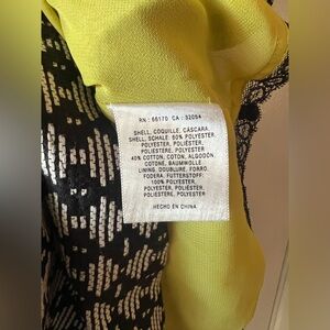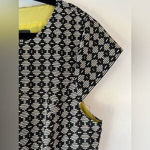 Black and white geometric pattern with chartreuse green lining - short cap sleeves - jewel neckline - fit and flare silhouette - zip back
