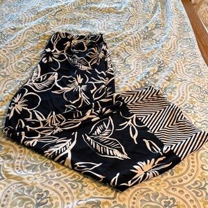 Stylish women's pants featuring a bold black and white floral pattern. Perfect for any occasion. Wide leg
