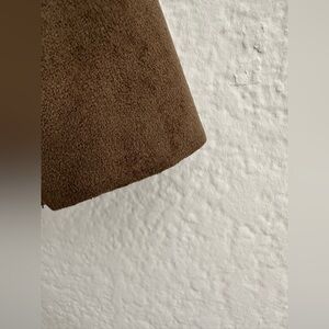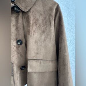Stylish tan vegan suede blazer by Zara. Features button closure and front pockets. Ideal for versatile wear. Measures 20 inches across from armpit to armpit, and from collar to him 21 inches top to bottom. Nice horn buttons and patch pockets in the front excellent very gently worn condition, no marks or spots on the suede Buttery soft, and a very flattering boxy cut.