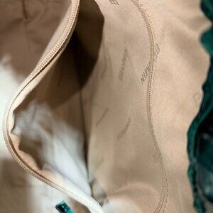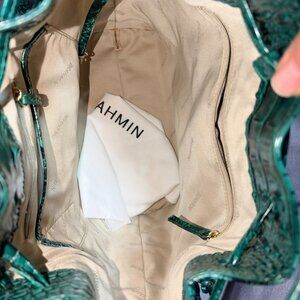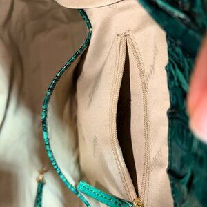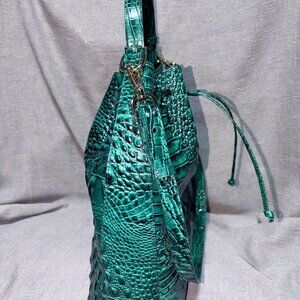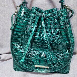 Stunning emerald green bucket bag by Brahmin. Nicely sized bag has short strap for arm carry and a longer strap for shoulder carry (not long enough for a crossbody). It also includes a Brahmin alligator bag charm.