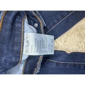 Medium to dark wash w/ fading along front and upper back; traditional 5-pocket design; mid-rise; logo tag on front coin pocket; zip fly w/ button closure