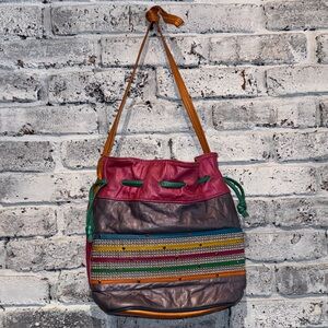 80s vintage Samir colorblock bucket bag. This vibrant piece features a unique drawstring design with a mix of colors. Perfect for adding a pop of color to any outfit. Rhinestones and jewel embellishments are the perfect touch. Really amazing condition!! Only flaw is minor wear on the bottom. Green, pink, orange and yellow tones. There are also blue stones. Bag drop Length is 24” with strap. Bag is approximately 11” x 12”