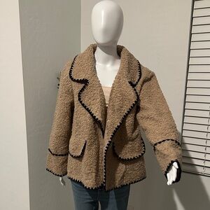 Stay warm and stylish with this cozy tan sherpa jacket featuring elegant black trim. Perfect for layering in cooler weather.