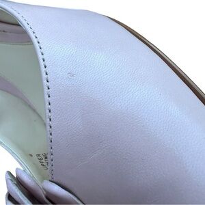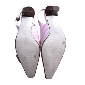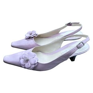 Elegant pink slingback heels. Floral embellishment on toe. Perfect for special occasions.