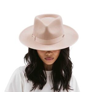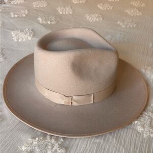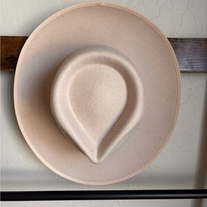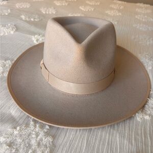 Chic tan hat with black interior. Stylish and versatile. Felt.