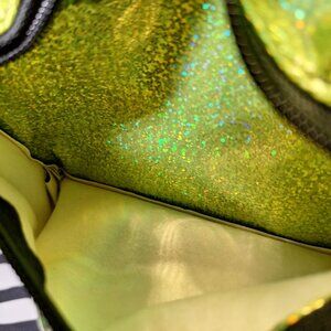 Yellow-Green Glitter, vinyl-like material with black interior, padding, trim, zippers and straps