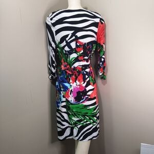 Stand out in this eye-catching Joseph Ribkoff dress, size Large. Featuring a vibrant mix of zebra stripes and tropical floral prints, this knee-length dress combines bold fashion with flattering comfort. The faux-wrap V-neckline and 3/4 length sleeves enhance the silhouette, while the lightweight stretch fabric ensures ease of movement. Perfect for vacations, parties, or brunch dates. Pair it with heels for a polished look or sandals for laid-back chic.