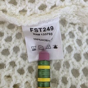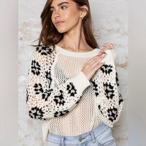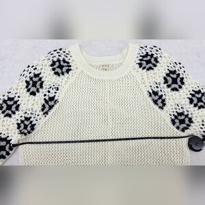 In excellent used condition POL open knit sweater with crochet sleeves women's size medium. No flaws. Stay cozy and stylish with this cream and black knit sweater. Perfect for layering, this sweater adds a chic touch to any outfit. Smoke free home.