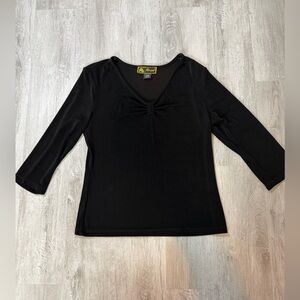 Classic black long sleeve top featuring a flattering ruched front detail and V-neckline. Soft, stretchy fabric provides a comfortable and flattering fit, perfect for both casual and dressy looks. Easy to style for work, everyday wear, or layering. A timeless wardrobe staple that pairs well with jeans, trousers, or skirts.