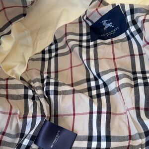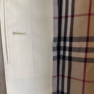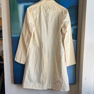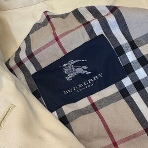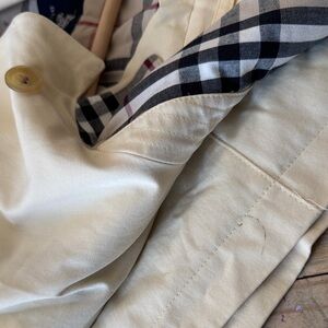 Stylish Burberry trench coat in a beautiful soft yellow features a collar with the signature nova check lining and a front button closure . Features classic button closure. Timeless elegance for any wardrobe. Please note that the belt is missing and it has some marks that may or may not come out with washing. But a beautiful piece with lots of life left!