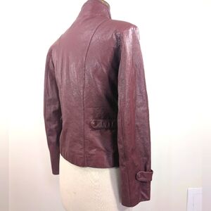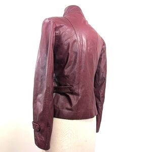 Vintage burgundy leather zip up jacket W straps at waist & cuffs. Medium