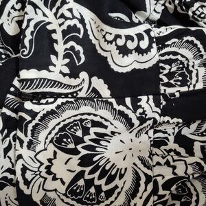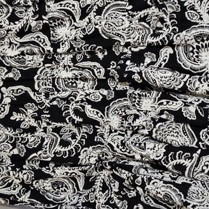Chic tiered broomstick skirt with intricate floral pattern. Perfect for versatile styling. Dress it up or wear it casually. Looks great with boots! Invisible zipper, hook and eye closure, 5-tiered skirt, not including the waist. Black and white pattern, size 12.