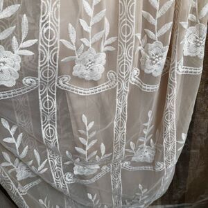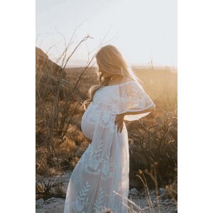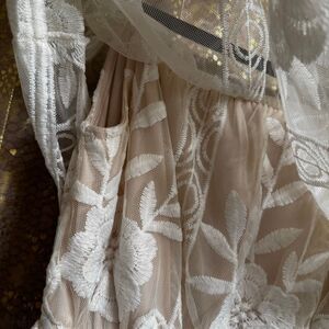 Brand new with tags, smoke and pet free home. No flaws. Gorgeous!! No longer sold. This is size medium, definitely bump friendly and can easily be used for maternity pics if you wanted to. This would absolutely make a gorgeous wedding dress too! The outer lace is white, and the inner liner is a light nude color. 100% Polyester.