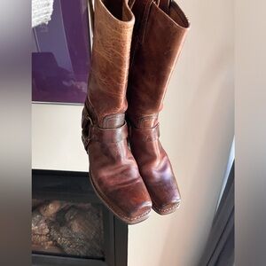 Pair of rich brown Frye harness boots. Soletech outsoles in great shape. 1.75” inch heel, approximately 11” toe to heel, 12.5” height. Faded size tag; 7.5 women.