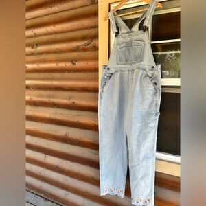 The cutest denim overalls! Light wash with a scalloped hem filled with bright, embroidered flowers. Would be the perfect pair of overalls for spending time in the garden this spring! Adjustable straps and front pocket.
