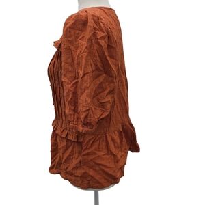 Chic terracotta blouse with ruffle detail. Perfect for versatile style.