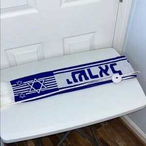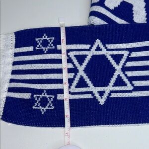 Show your support with this stylish blue and white scarf featuring the Star of David. Perfect for adding a touch of pride to any outfit.