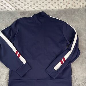 Classic Polo Ralph Lauren track jacket in a deep navy blue preowned. This piece features a striking white racing stripe down the sleeves with unique red horizontal bars near the cuffs. The signature white pony logo is embroidered on the chest.