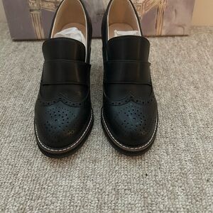 Chic black loafers with a stylish heel. Perfect for versatile wear.