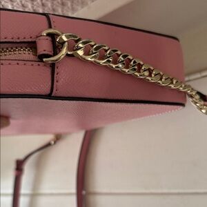 Elegant Michael Kors crossbody in blush pink. Features sleek design and chain strap detail.