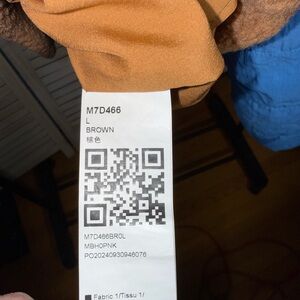 Stylish brown fleece jacket with blue quilted sleeves. Features a vibrant orange pocket for a pop of color.