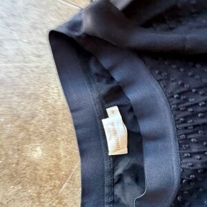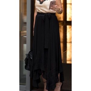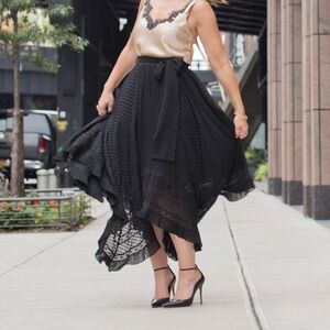Zimmermann black textured handkerchief‑hem skirt in size 2 (equivalent to a Medium) – a romantic, statement piece that twirls beautifully and works for weddings, parties, and special events. This floaty midi/maxi skirt features a wide waistband with an attached self‑tie sash, a soft textured dot fabric, and tiered pleated panels that cascade into an asymmetric handkerchief hem. Partially lined through the body with a semi‑sheer effect near the hem, it feels light and airy while still offering coverage. Dress it up with a lace camisole and heels or down with a simple tee and sandals for a chic, feminine look.