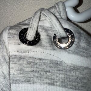 Chic mini dress with gray and white stripes. Short sleeves. Casual and stylish.