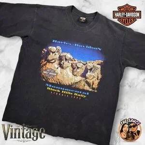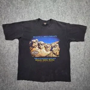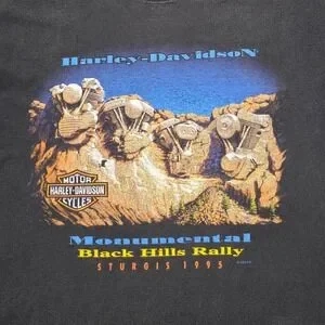 This vintage 1995 Harley-Davidson t-shirt is in good condition with a natural fade that adds to its authentic character. Classic Black Hills Rally Sturgis 1995 graphic on the front features a "Monumental" engine design inspired by Mount Rushmore, while the back showcases a bold eagle and "Rapid City South Dakota" branding. Crafted from 100% cotton, this single-stitch style piece offers a comfortable, relaxed fit perfect for collectors and enthusiasts alike. Great for motorcycle rallies, casual weekend outings, or as a standout piece for vintage streetwear lovers.