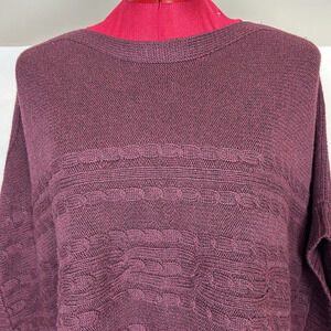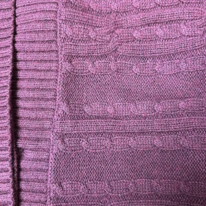 Notice how the cable knit runs horizontally rather than vertically and there are two colours in the yarn to give more visual interest. Super comfortable and warm pullover style. This is a very roomy XS; will fit a size small as well. 60% cotton, 30% nylon, 10% wool. Back length: 25”