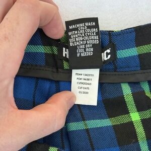 Hot Topic pleated mini skirt features a vibrant blue, green, and black plaid pattern. This schoolgirl-inspired piece is crafted from a durable polyester and rayon blend, offering a comfortable fit with a side zipper closure and belt loops. Perfect for punk, emo, or academic aesthetics.