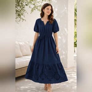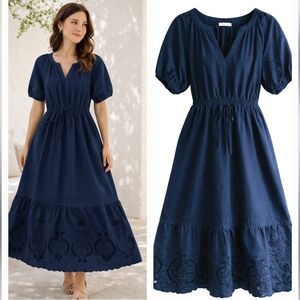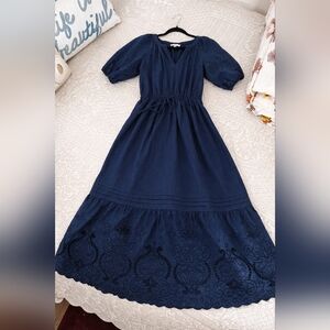 MOON RIVER Women's NAVY Blue Embroidered Midi Tiered Dress PUFF Sleeves Size M