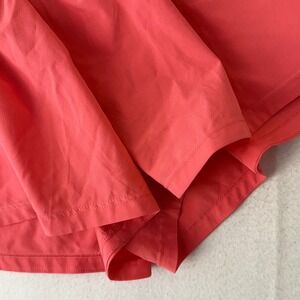 JoyLab running shorts in a vibrant coral pink hue, designed for performance and comfort. These athletic shorts feature a wide, ribbed high-rise waistband for a secure fit and a relaxed, flowy outer layer with side slits for maximum range of motion. Constructed from a lightweight, moisture-wicking recycled polyester blend, they include a built-in liner for added coverage during workouts. Subtle tonal logo detailing is located near the hem.