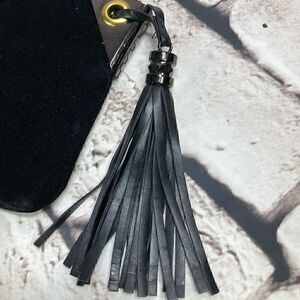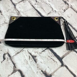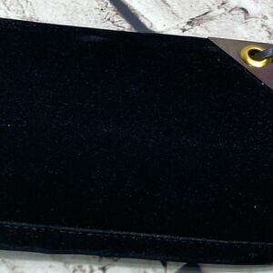 A beautiful jet black velvet clutch with gunmetal and accent gold accent and a PU leather tassel accessory.