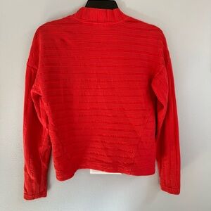 Maeve by Anthropologie long sleeve top in a vibrant red hue features a unique textured horizontal stripe pattern throughout the body and vertical ribbing on the sleeves. Designed with a mock neck and four decorative tonal buttons along the left shoulder for a nautical-inspired touch. This 100% cotton knit offers a comfortable, breathable fit with a slightly cropped, boxy silhouette. perfect for transitional weather or layering.
