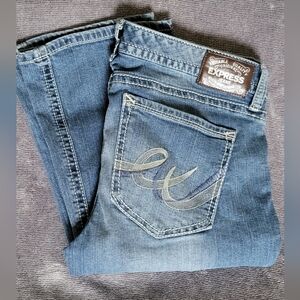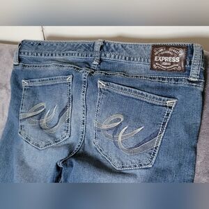 Express brand women's denim jeans featuring a classic low-rise fit and distinctive embroidered back pockets. This specific style, often associated with Y2K fashion, typically includes thick contrast stitching and a bootcut style.