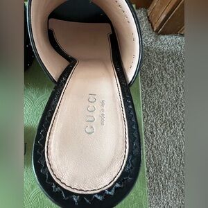 Gucci black platform mules with iconic logo silver detailing. Some leather creasing shown in photos. One small scratch on leather interior as shown in photo. New with box and dustbags. May have been floor model. Size 39. All sales final.