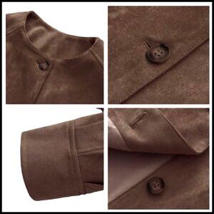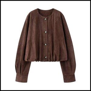 Oversized Faux Suede Bomber Jacket Gathered Hem Short Length Button Closure