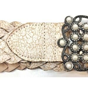 Braided Cream Faux Leather Belt With Faux Pearl & Silver Buckle Womens XL Dressy