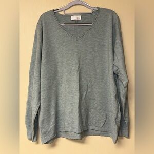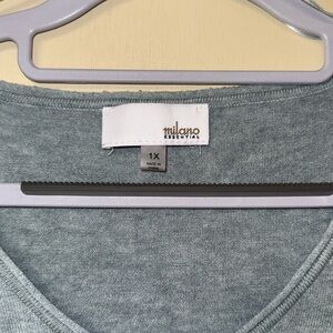 Elegant V-neck sweater by Milano. Soft and comfortable. Ideal for layering. Blueish gray in person. See last picture for color comparison against a gray sweater.