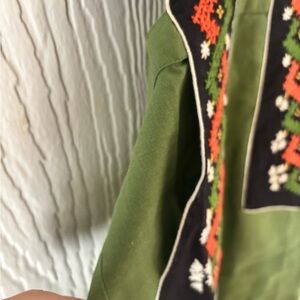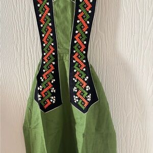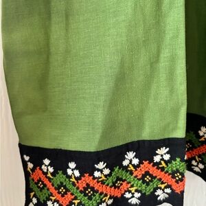 Excellent, never worn condition. I believe a cotton linen blend but not sure. Gorgeous green with black, orange and white geometric and flower detailing. Two small pockets. Scandinavian style, unbranded.