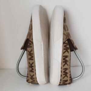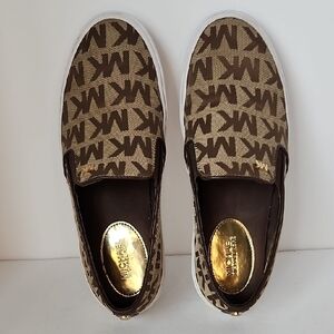 Stylish Michael Kors loafers with signature logo pattern. Easy slip-on design. Ideal for casual wear.