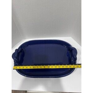 Bordallo Pinheiro Serving Platter "Travessa" Made in Portugal Color Blue The Bordallo Pinheiro brand is well-known for Portuguese pottery, and features signature basket weave pattern handles. Oval elongated shape, raised sides to hold food, integrated handles at each end. Hand glazed and made of earthenware. Excellent preowned condition. No chips, cracks, crazing.