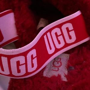 Cozy red slippers with fluffy texture. UGG branding on straps. Perfect for comfort and style.