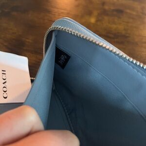 Elegant Coach wristlet with signature pattern. Features a large logo detail and strap. Clean inside, tiny signs of use, maybe some light rub On outside.