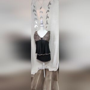 Vallian Black with Leopard Accents Tankini Size 3XL Top: L: Front Between Cups: 16' Back: 16' Skort Bottoms W: 19' Inseam: 11'
