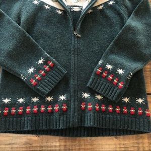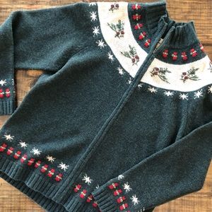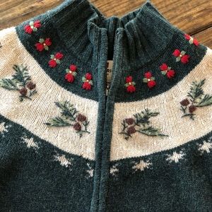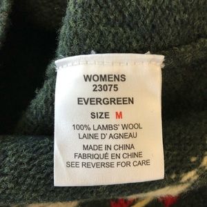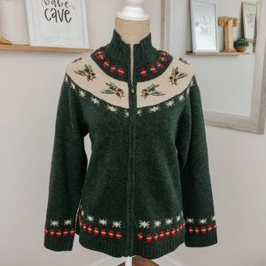 Cozy green sweater with festive red and white accents. Features a cowl neck and intricate patterns. Perfect for chilly days.