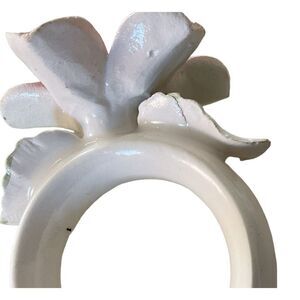 floral napkin rings and burgundy cloth napkins. One repaired area as shown. Does not show with napkins in them. 17” X 17”.